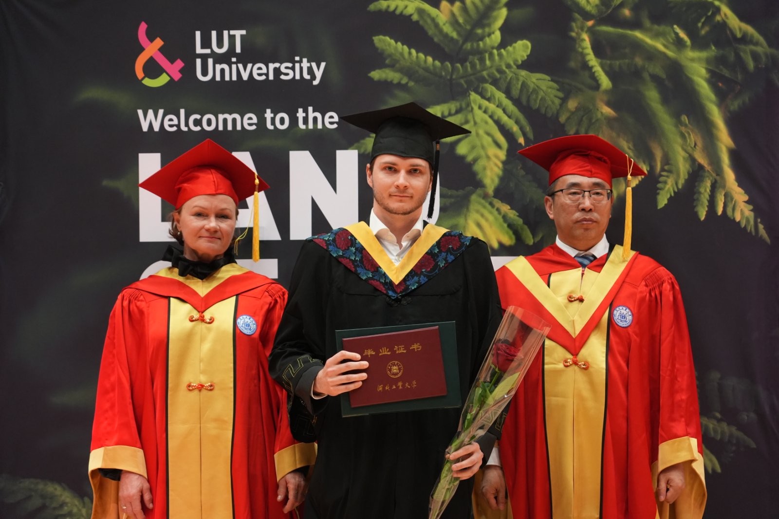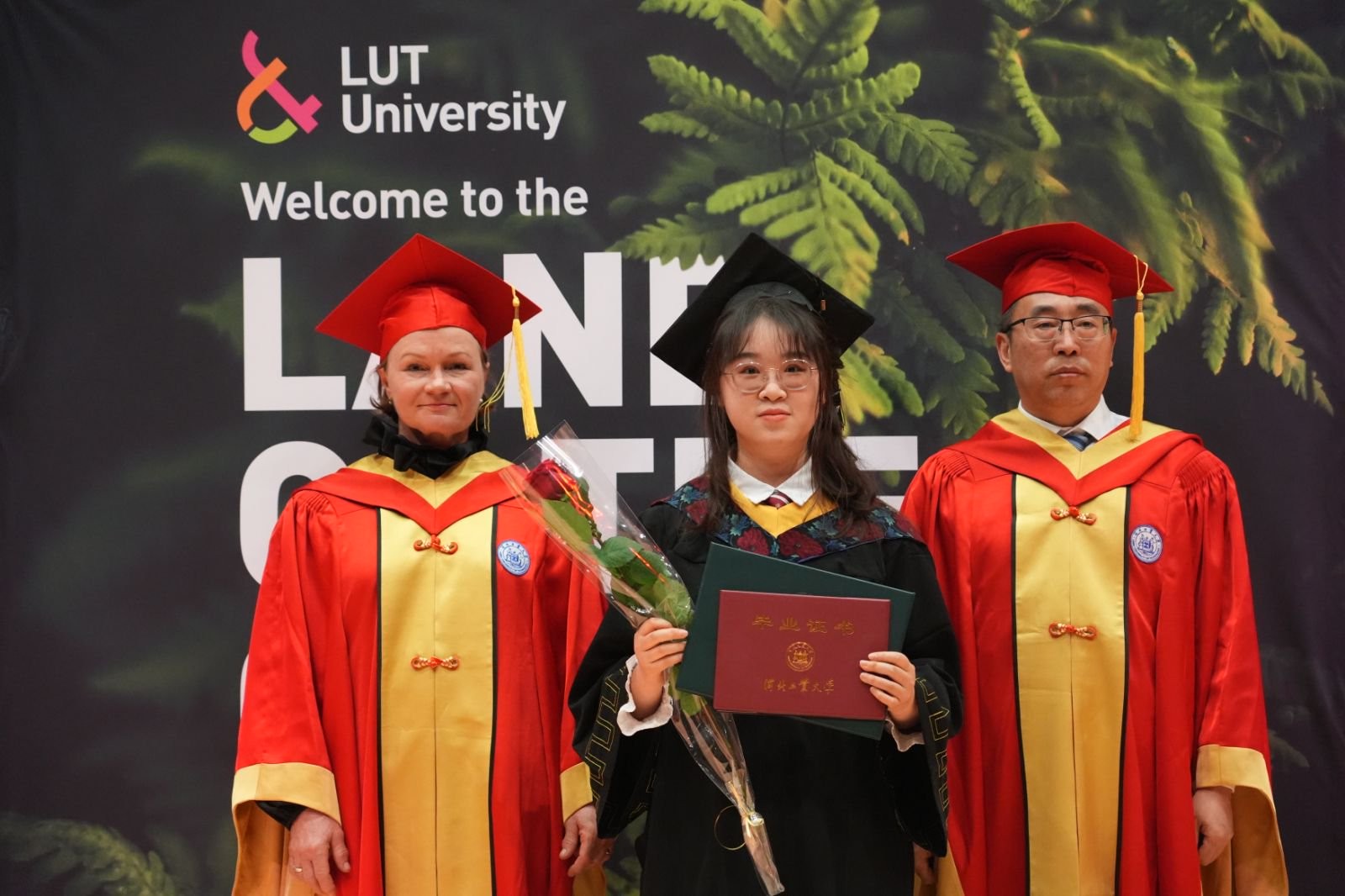 JAANASANDSTRÖM发表致辞。她高度评价了芬兰校区的办学成果,认为双方的合作模式在全球高等教育合作中具有重要的示范意义;特别赞扬了两校教职工在合作过程中展现出的开拓创新精神,并对他们为两校所作出的贡献表示衷心感谢。JAANA寄语毕业生,期望他们在未来的生活中始终保持好奇心与独立思考的科学精神,勇于探索、敢于创新,不盲从、不止步,勇敢走出属于自己的道路;能够将所学付诸实践,为推动人类福祉和全球可持续发展贡献智慧与力量;诚挚邀请毕业生加入LUT全球校友网络,继续与母校保持联系,无论身在何方,始终心系LUT,共同迎接更加美好的未来。