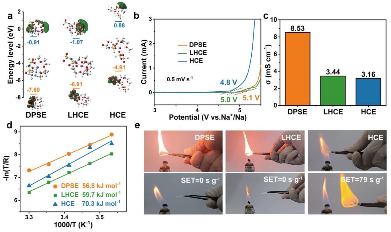 由于资源丰富、成本低廉以及潜在的高能量密度等优势,钠/钾金属(离子)电池在电化学储能领域极具发展潜力。电解液是二次电池的重要组成之一,直接决定了电池的输出电压、循环寿命、安全性能以及离子扩散动力学。醚类电解液因具有与电极材料良好的兼容性而被广泛研究。然而,现有醚类电解液的电化学稳定性不足(< 4.0 V),在充电过程中会先于电极发生氧化反应而分解,无法满足电极在高电压(> 4.0 V)下的工作需求,从而限制电极的容量。同时,缓慢的扩散动力学也会导致Na+/K+由电解液/负极界面向负极内部扩散受阻,易在负极表面生成钠/钾枝晶,带来安全隐患。此外,醚类电解液对电极微观结构的影响也缺乏深入研究。针对上述问题,层状材料与器件团队雷凯翔副教授与团队成员博士后眭思密和硕士研究生李嘉欣等人利用稀释剂或共溶剂参与溶剂化结构的策略构筑阴离子衍生的电极/电解液界面膜(EEI)来提升电解液的氧化稳定性并抑制枝晶生长,同时探究了电解液中有机溶剂的电荷分布以及溶剂与盐阴离子的官能团对电极微观结构的影响。