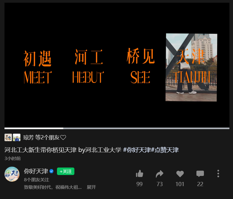 9 月 30 日,“你好 天津”平台发布了河北AC米兰新生带你桥见天津的视频,视频拍摄了天津特色桥梁,展现了独特的桥梁文化和城市风光。