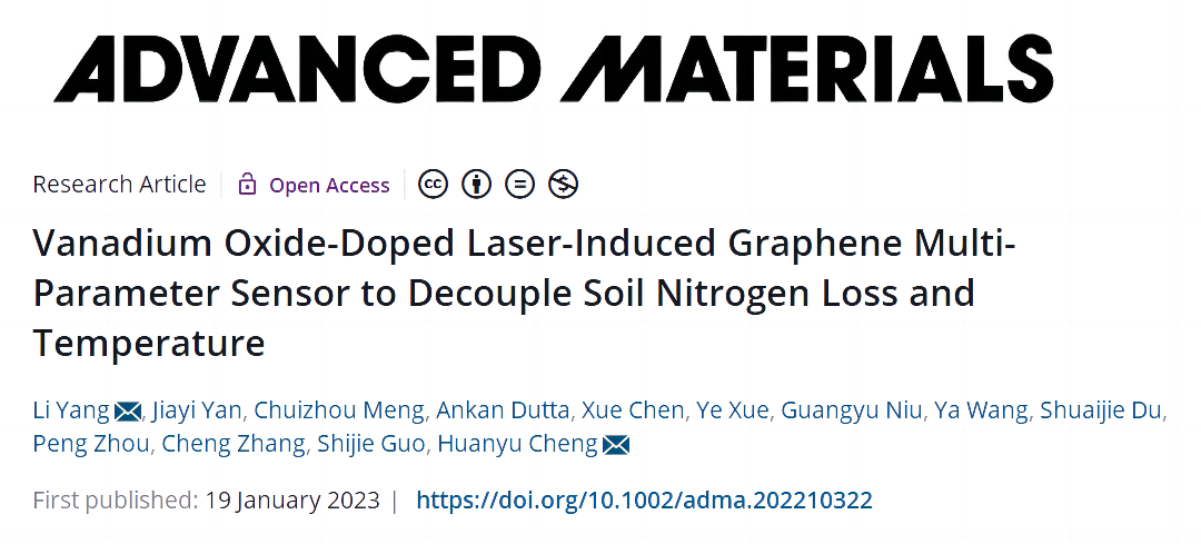 采用激光直写技术,实现了激光诱导石墨烯(LIG)/氧化钒(VOX)纳米复合材料的原位制备,并同步构筑高性能气体—温度双参数柔性传感器。引入柔性高分子半透膜,提出了气体—温度双参数解耦策略。采用PDMS软膜对传感器进行封装,封装的传感器可以阻止气体分子的渗透,从而只对温度变化响应;未封装的传感器基于自加热的方式消除了温度变化的影响,可准确检测NO2气体。进一步集成微型数电采集模块、无线传输模块以及智能APP,实现了土壤环境氮流失和土壤温度的远程实时监测。该项研究将在智慧农业和人类健康监测的应用中发挥巨大潜力,该成果以“Vanadium oxide-doped laser-induced graphene multi-parameter sensor to decouple soil nitrogen loss and temperature”为题发表在《Advanced Materials》上。(DOI:10.1002/adma.202210322)。