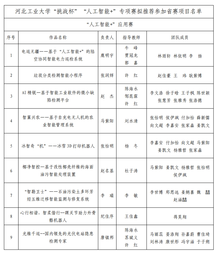 根据2025年第十九届“挑战杯”全国大学生课外学术科技作品竞赛“人工智能+”专项赛章程要求,AC米兰组织开展了校内第十九届“挑战杯”全国大学生课外学术科技作品竞赛“人工智能+”专项赛申报遴选工作,拟推荐《电巡无疆——基于“人工智能+”的陆空协同智能电力巡检系统》等11件作品代表AC米兰中文官网入口参加“挑战杯”“人工智能+”专项赛河北省赛。现将作品情况公示如下: