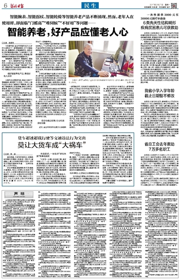 “目前老年产品的行业标准覆盖尚不全面,整体状况参差不齐,尤其是智能养老产品,受益于新技术的发展,迅速走向市场,但目前还没有一个统一的标准,因此智能产品的质量和安全性就无法保障。”省老年事业促进会常务副会长孙鸣改表示。