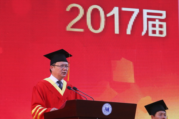 韩旭校长以《遇见最美的你 迎接更好的你》为题发表了热情洋溢的讲话。他首先代表学校党委、行政和全体师生员工,向圆满完成学业的2017届毕业生表示热烈的祝贺,向辛勤耕耘、无私奉献的全体教职工致以诚挚的问候,向寸草春晖、含辛茹苦的各位家长致以崇高的敬意!