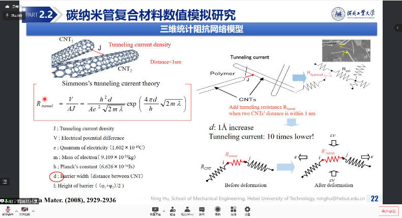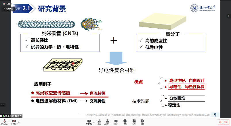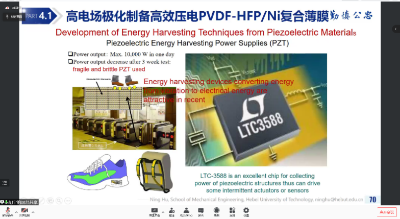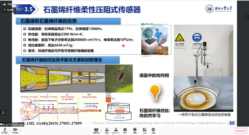 胡校长在报告中从电子导电类纳米复合材料的导电性能、压阻性能的数值模拟出发,讲述导电类纳米复合材料压阻效应的机理,梳理出影响传感灵敏度的关键因素,并介绍其科研团队所研发的各类压阻型纳米复合材料及其特性,同时讲解基于纳米添加相改性的PVDF压电类高分子材料的压电性能,最后汇报了基于羟基磷灰石纳米线/水凝胶材料的柔性离子皮肤方面的最新进展。
