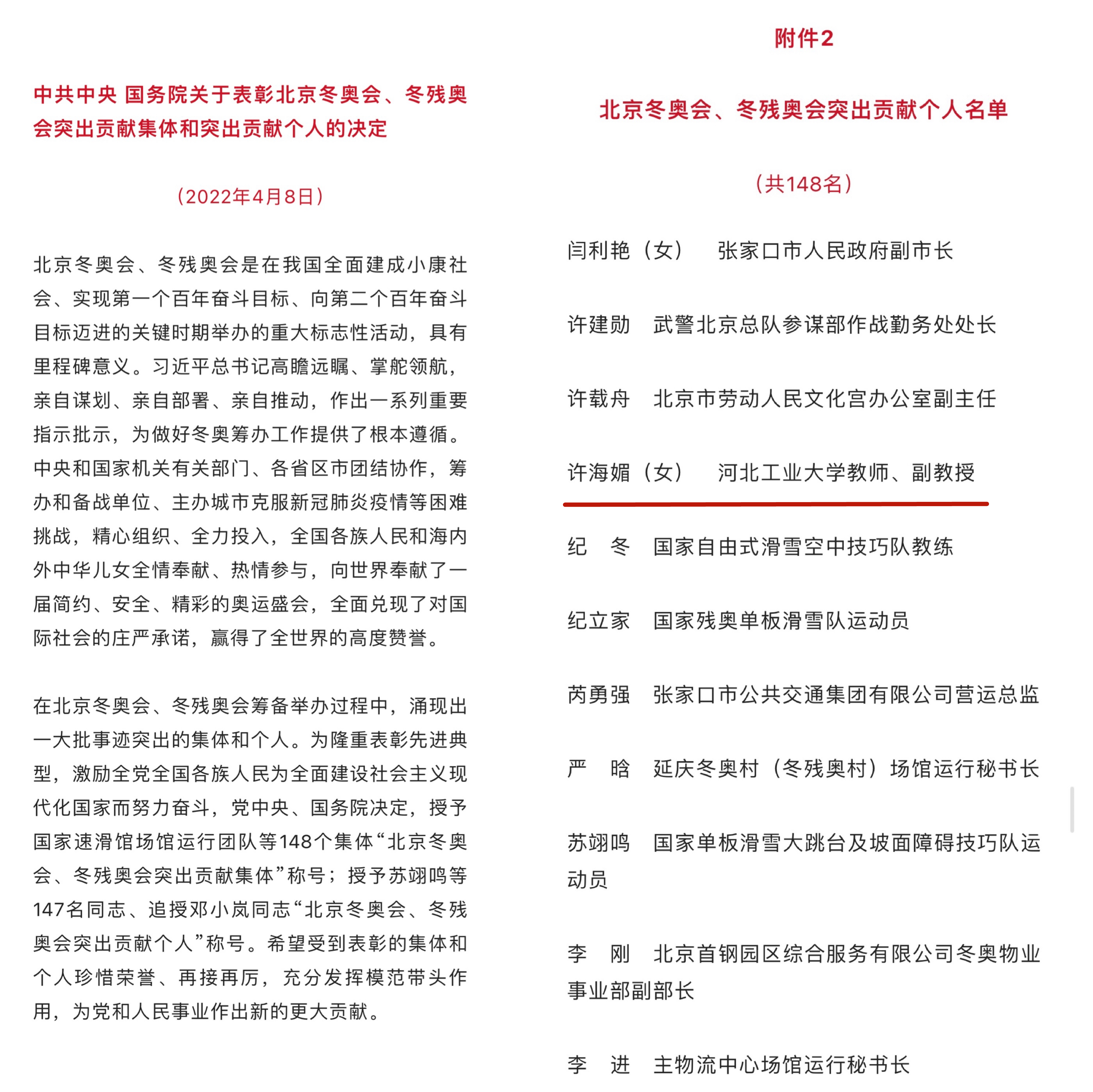 4月8日,北京冬奥会、冬残奥会总结表彰大会在京举行。148个集体、148名同志获得表彰。AC米兰冬奥志愿者、材料科学与工程学院学工办主任兼团委书记许海媚被授予“北京冬奥会、冬残奥会突出贡献个人”称号。