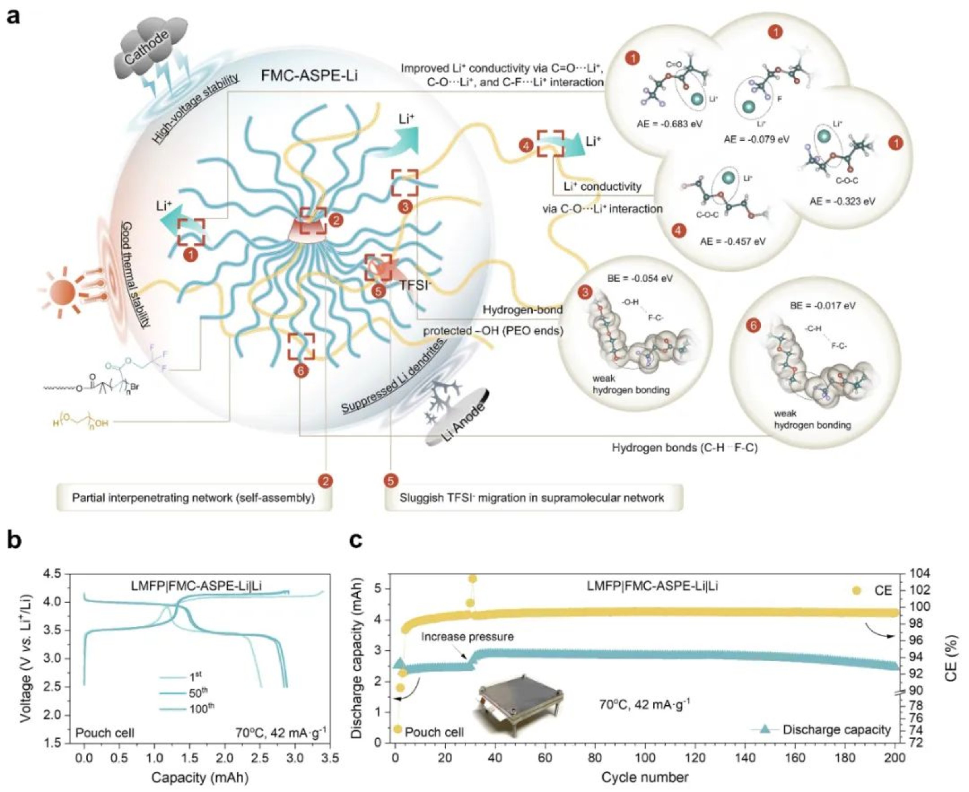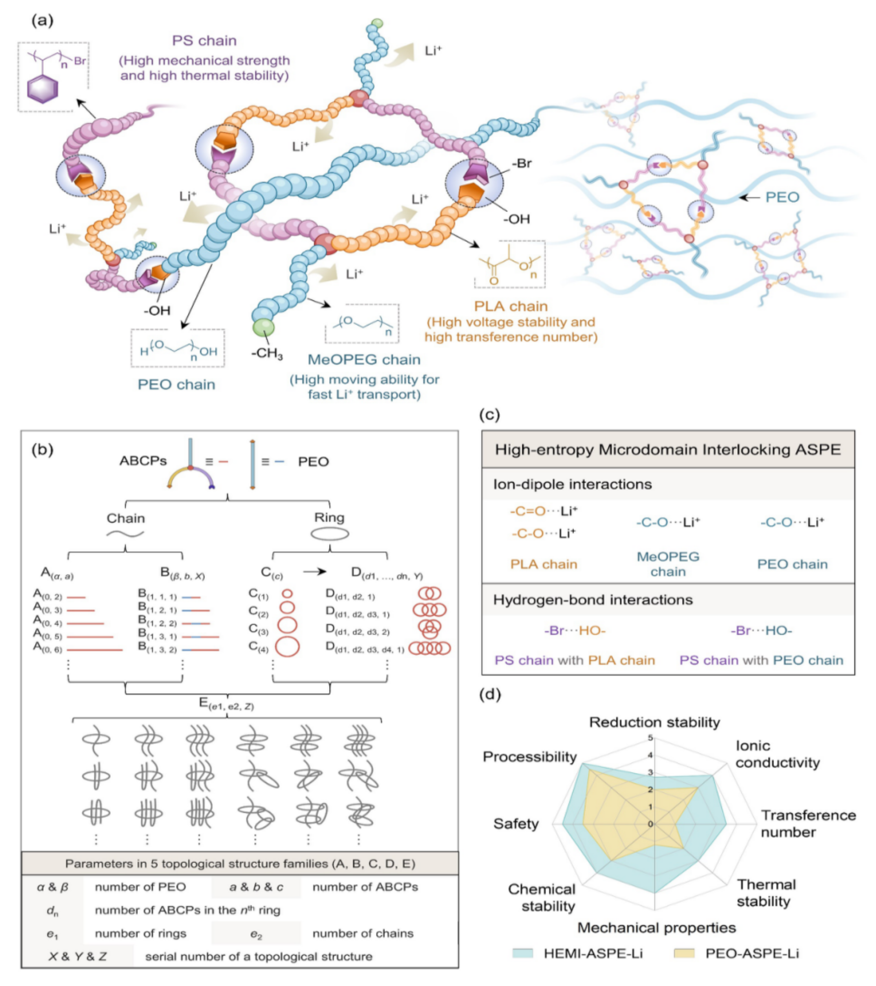 此后,针对固态聚合物电解质普遍存在的机械强度和离子电导率难以同时提升的矛盾,联合团队通过超分子自组装驱动的高熵微域互锁策略,实现了高机械强度、高离子电导率和高阳离子迁移数的新型全固态聚合物电解质。该工作于2022年11月3日发表在材料领域国际著名期刊Advanced Materials(先进材料)(IF:32.086)上发表题为“High-Entropy Microdomain Interlocking Polymer Electrolytes for Advanced All-Solid-State Battery Chemistries”(高熵微区互锁聚合物电解质助力高性能全固态电池)。